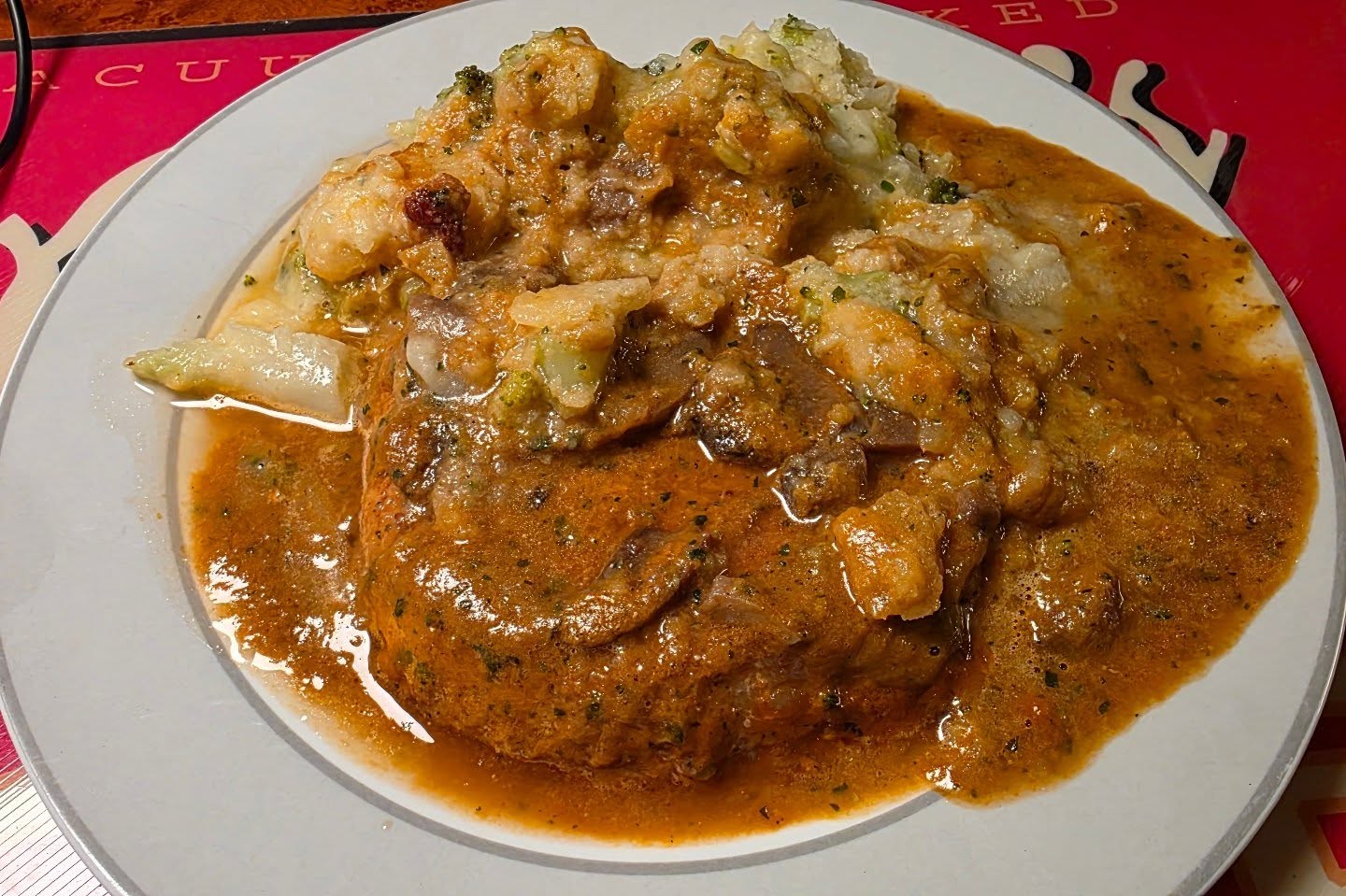 Schweinerücken-Steak in Champignon-Sauce mit Kartoffel-Brokkoli-Stampf